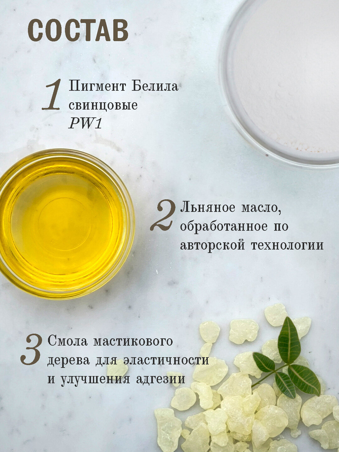 В составе краски углекислый свинец (свинцовые белила) и связующее из подготовленного льняного масла и смолы мастикового дерева. Краска не содержит наполнители и растворители. По консистенции свинцовые белила представляют собой более вязкую пасту, чем другие виды белил. Цвет характеризуется как тёплый белый.