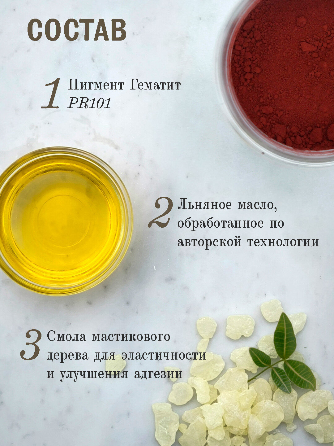 Краска изготовлена на основе пигмента "Гематит PR101" в максимальной концентрации. Связующее вещество состоит из подготовленного льняного масла и смолы мастикового дерева. В составе краски отсутствуют наполнители и растворители.