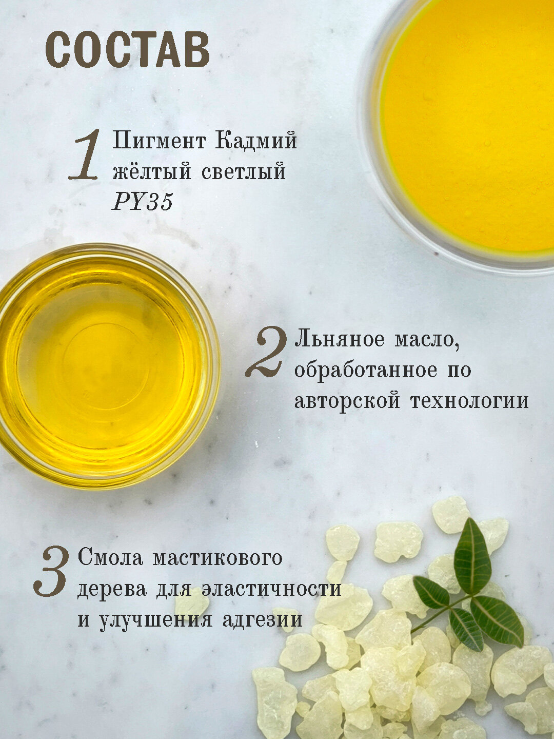 Состав краски включает пигмент "Кадмий жёлтый светлый PY35" в максимальной концентрации, а также связующее из подготовленного льняного масла и смолы мастикового дерева. Благодаря этому, краска обладает отличной адгезией и комфортным временем высыхания. В составе отсутствуют наполнители и растворители.
