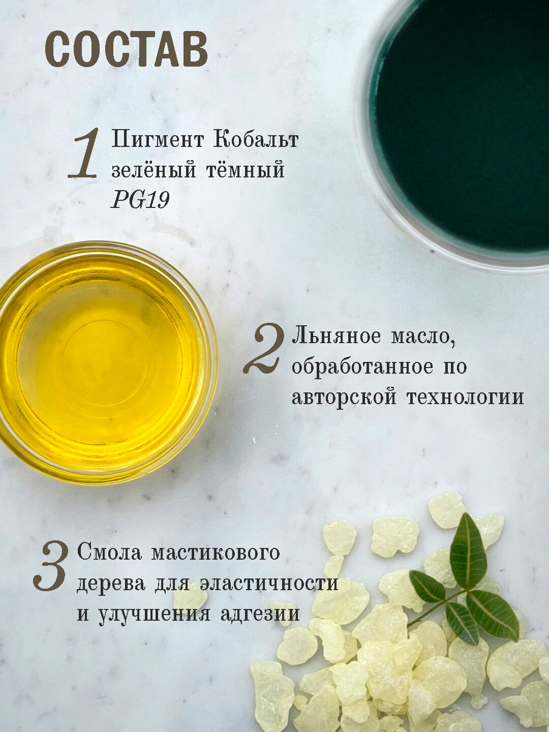 Краска изготовлена из пигмента "Кобальт зелёный тёмный PG19" в максимальной концентрации, что обеспечивает насыщенность и яркость цвета. Связующее состоит из подготовленного льняного масла и смолы мастикового дерева. В составе краски отсутствуют наполнители и растворители.
