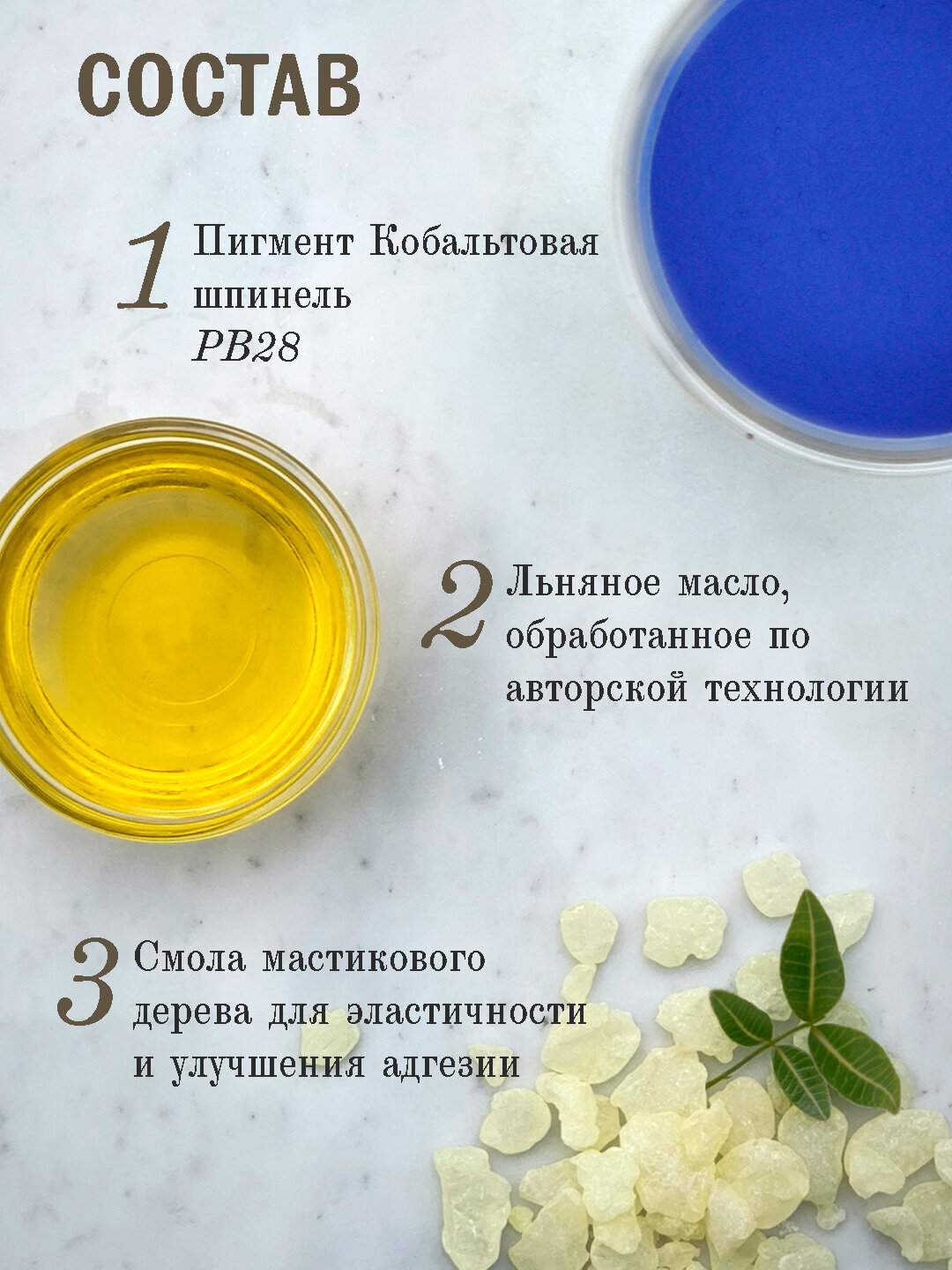 Состав краски включает пигмент "Кобальтовая шпинель PB28" в максимальной концентрации, а также связующее из подготовленного льняного масла и смолы мастикового дерева. В составе отсутствуют наполнители и растворители. Благодаря этому составу, краска сохраняет яркость и насыщенность цвета на протяжении длительного времени.