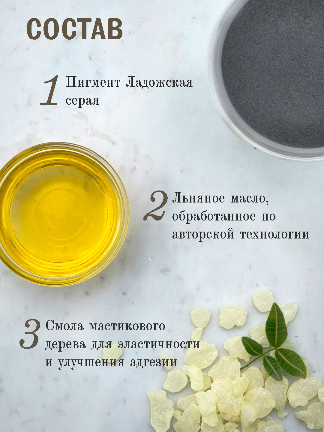Ладожская серая - это природный пигмент, произведённый из серпентинитовых скарнов, горной породы зелёно-серого цвета, встречающейся в Приладожье. Связующее состоит из подготовленного льняного масла и смолы мастикового дерева. В составе краски отсутствуют наполнители и растворители.