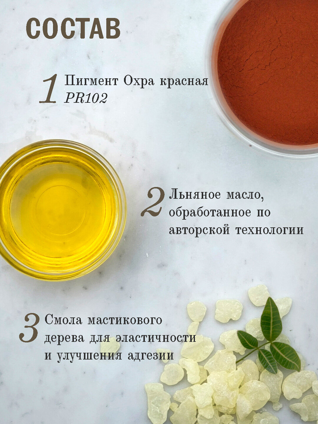 Краска создана на основе одноимённого пигмента, представляющего собой продукт отжига природной жёлтой охры, также называемого "жжёной охрой". Связующее состоит из подготовленного льняного масла и смолы мастикового дерева. Краска не содержит наполнители и расворители.