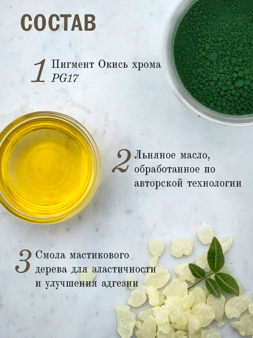 Состав краски включает в себя пигмент "Окись хрома PG17" в максимальной концентрации, а также связующее из подготовленного льняного масла и смолы мастикового дерева.