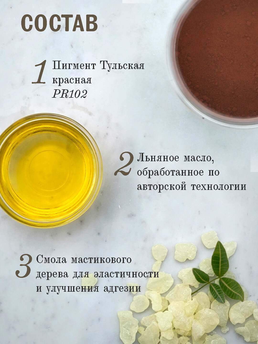 Состав: пигмент в максимальной концентрации, связующее из подготовленного льняного масла и смолы мастикового дерева. В составе краски отсутствуют наполнители и растворители.