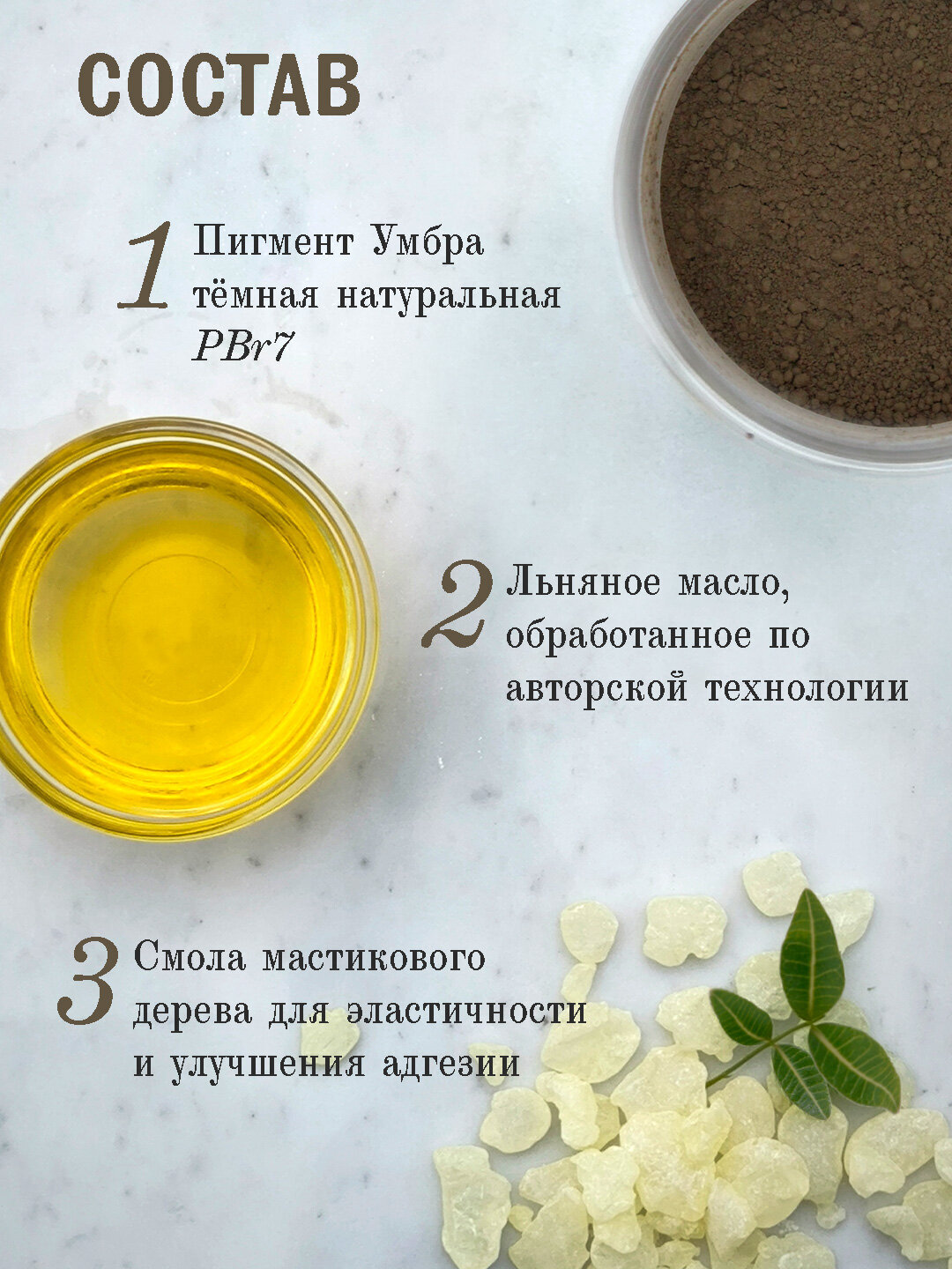 Краска состоит из природного пигмента "Умбра тёмная натуральная PBr7" в максимальной концентрации, подготовленного льняного масла и смолы мастикового дерева. В составе отсутствуют наполнители и растворители.